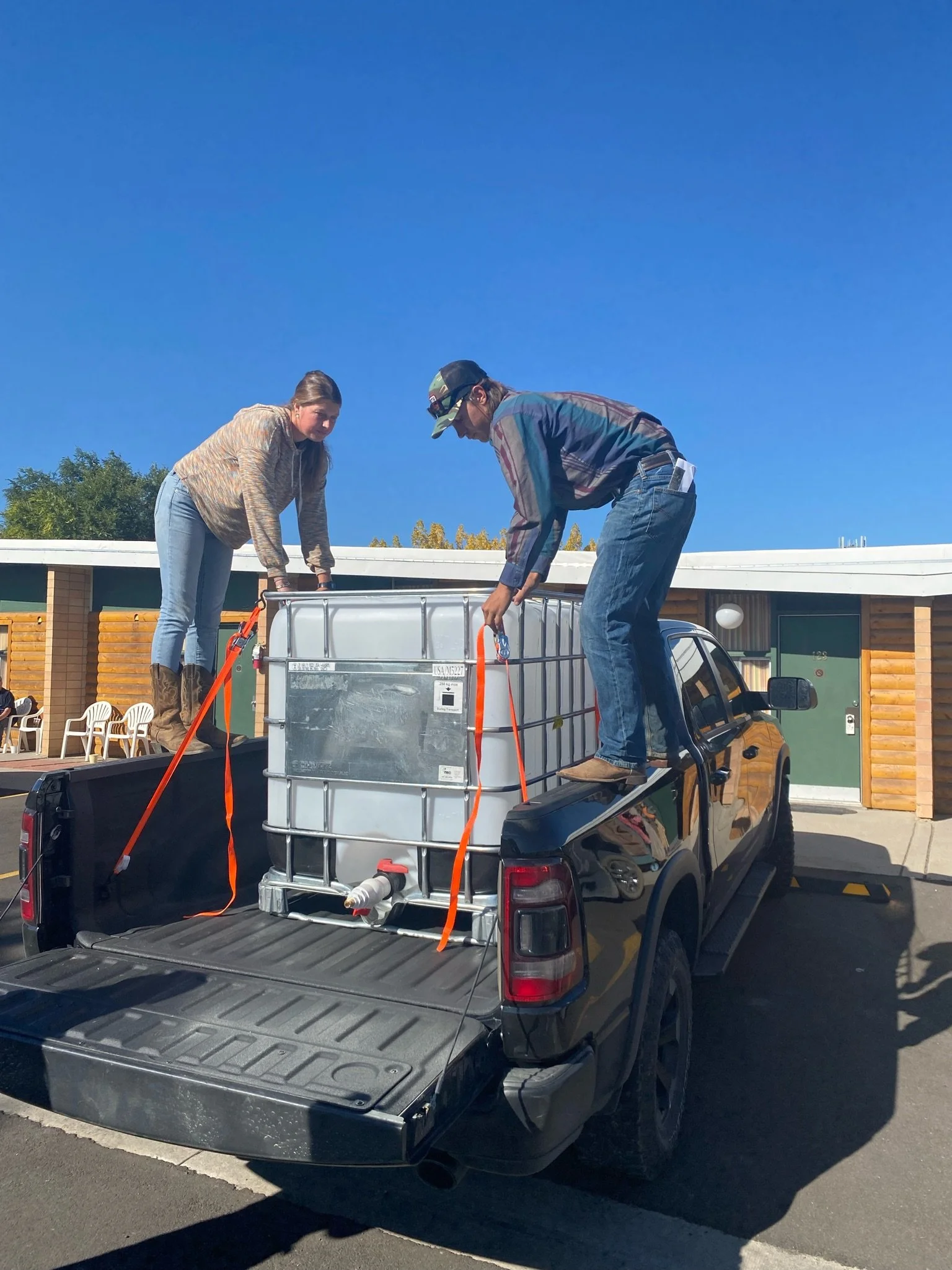 Matt and Louisa strapping down a 250-gallon water tank to drop water caches in the desert